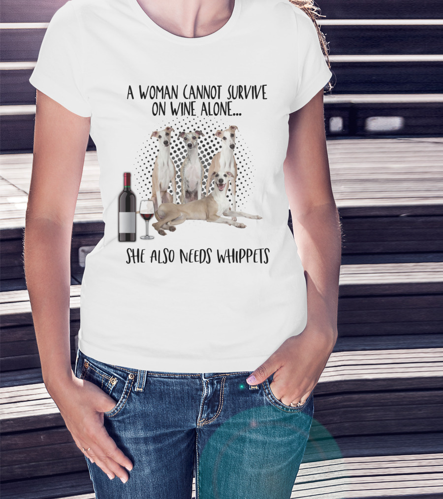 A Woman Cannot Survive On Wine Alone She Also Needs Whippets With Bottle And Glass T-Shirt