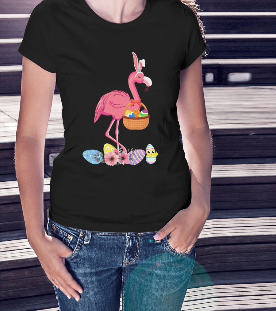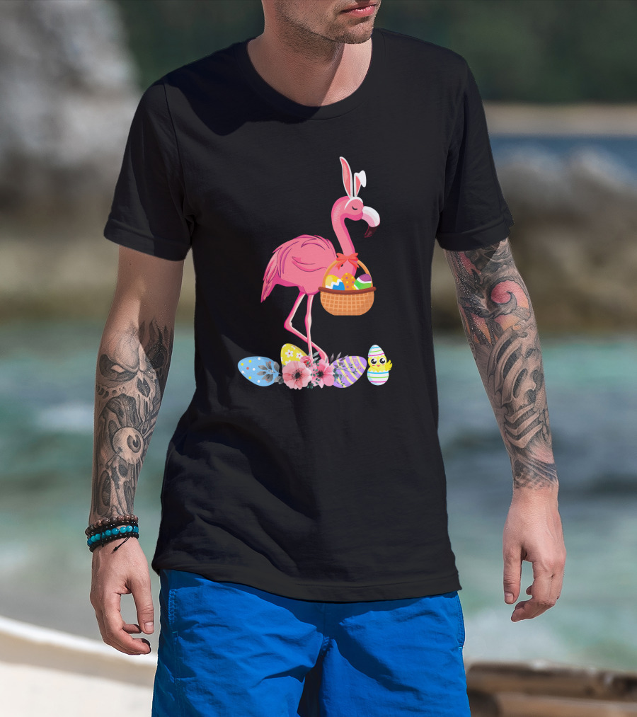 Flamingo With Easter Basket And Colorful Eggs T-Shirt