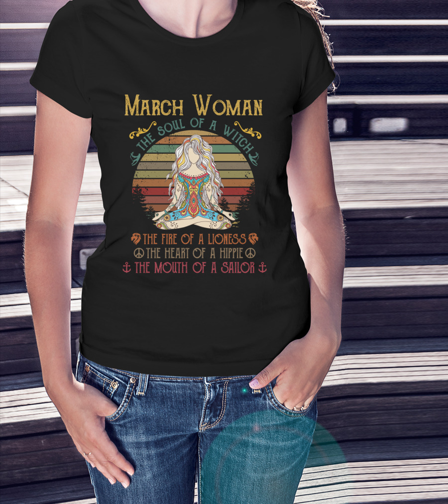 The March Woman the Soul of a Witch the Fire of a Lioness the Heart of a Hippie the Mouth of a Sailor T-shirt is designed for everyday wear and a consistent fit. Fabric is pre-shrunk ring-spun cotton with durable stitching. See the size chart below for exact measurements.