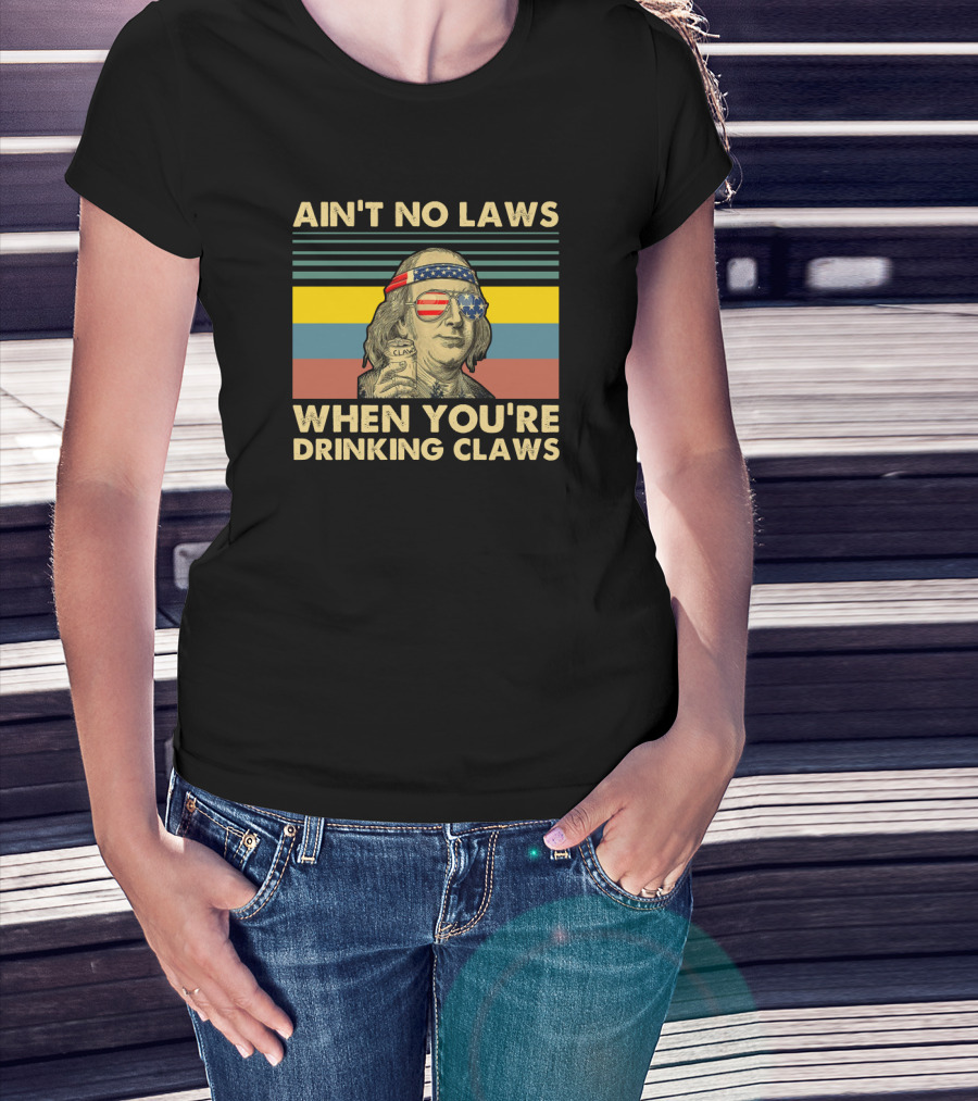 How much will this AIN'T NO LAWS WHEN YOU'RE DRINKING CLAWS VINTAGE BENJAMIN FRANKLIN WITH AMERICAN FLAG GLASSES AND HEADBAND CAN OF CLARIFIED BEVERAGE STRIPES BACKGROUND shirt shrink?