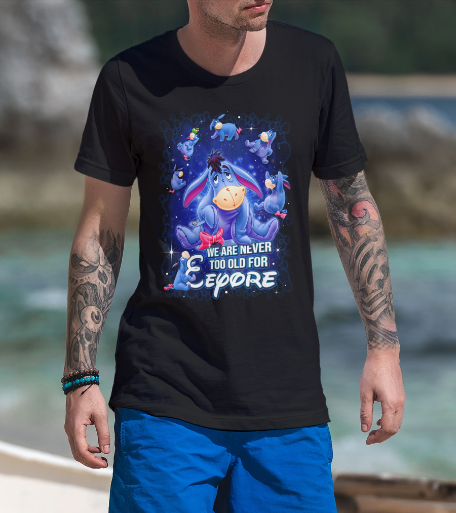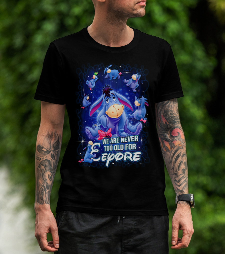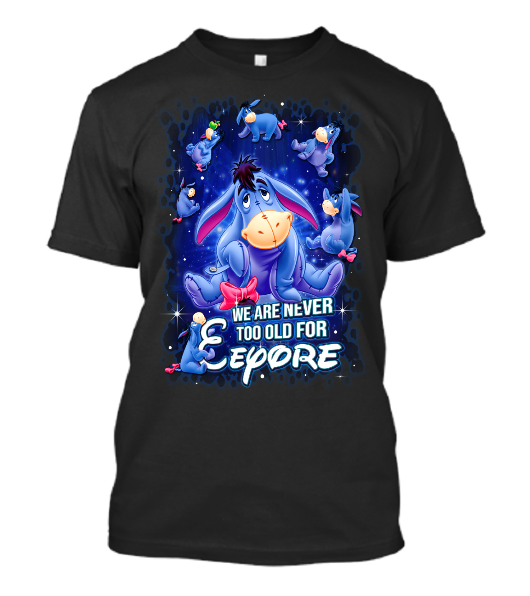 The We Are Never Too Old for Eeyore T-shirt is designed for everyday wear and a consistent fit. Fabric is pre-shrunk ring-spun cotton with durable stitching. See the size chart below for exact measurements.
