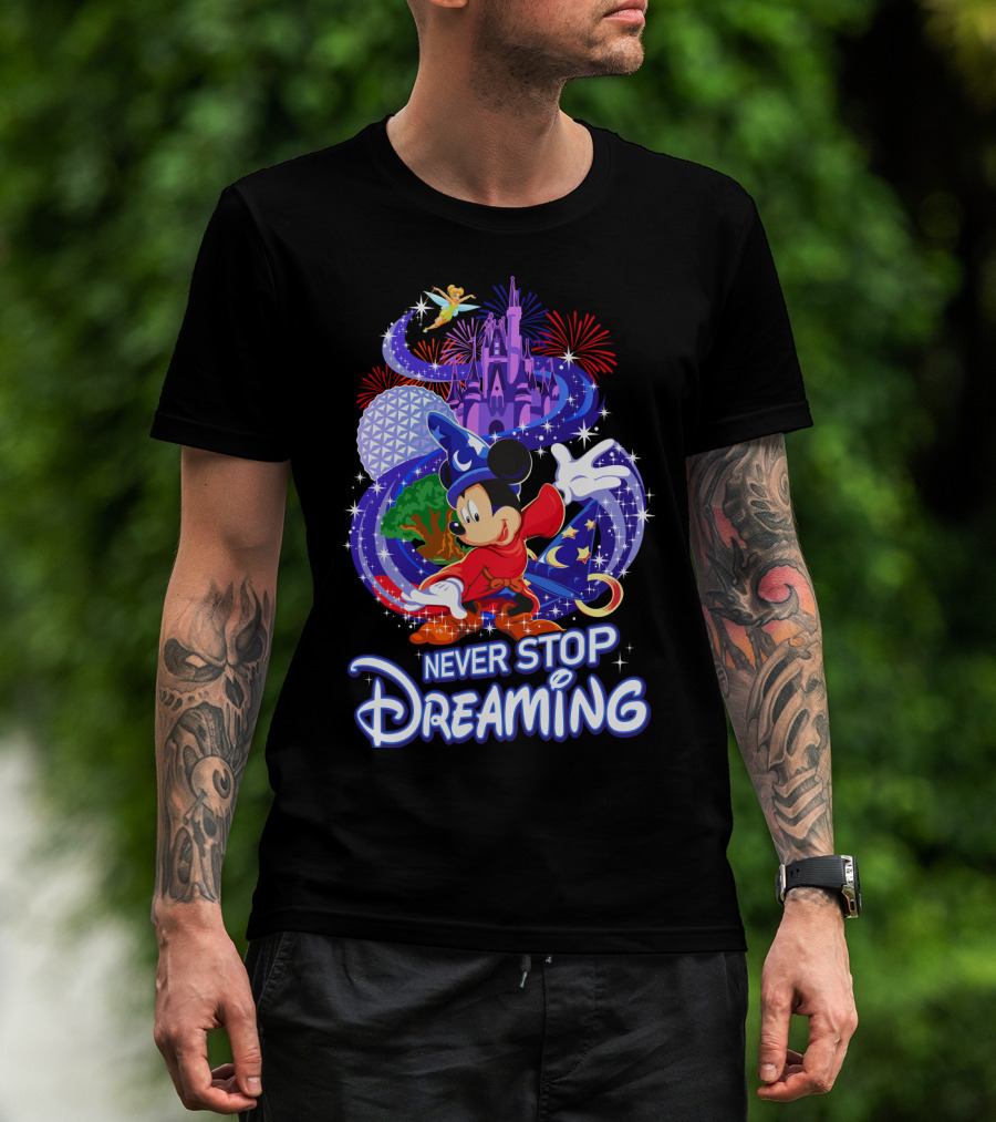Never Stop Dreaming Mickey Sorcerer Castle Fireworks T-Shirt