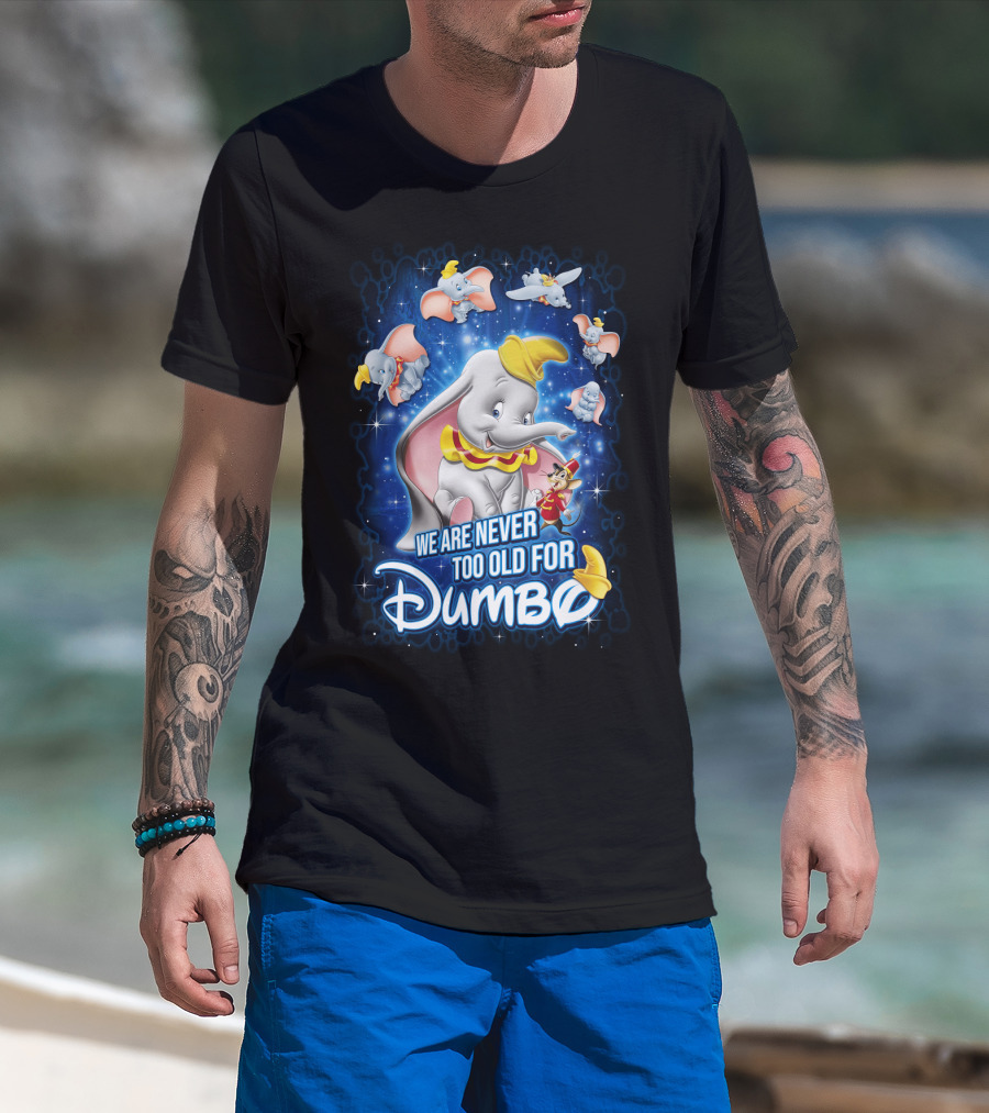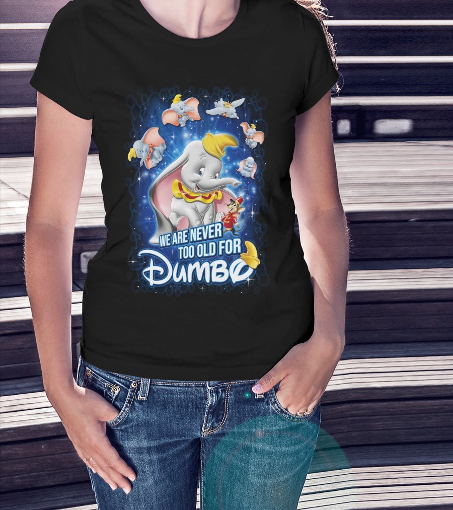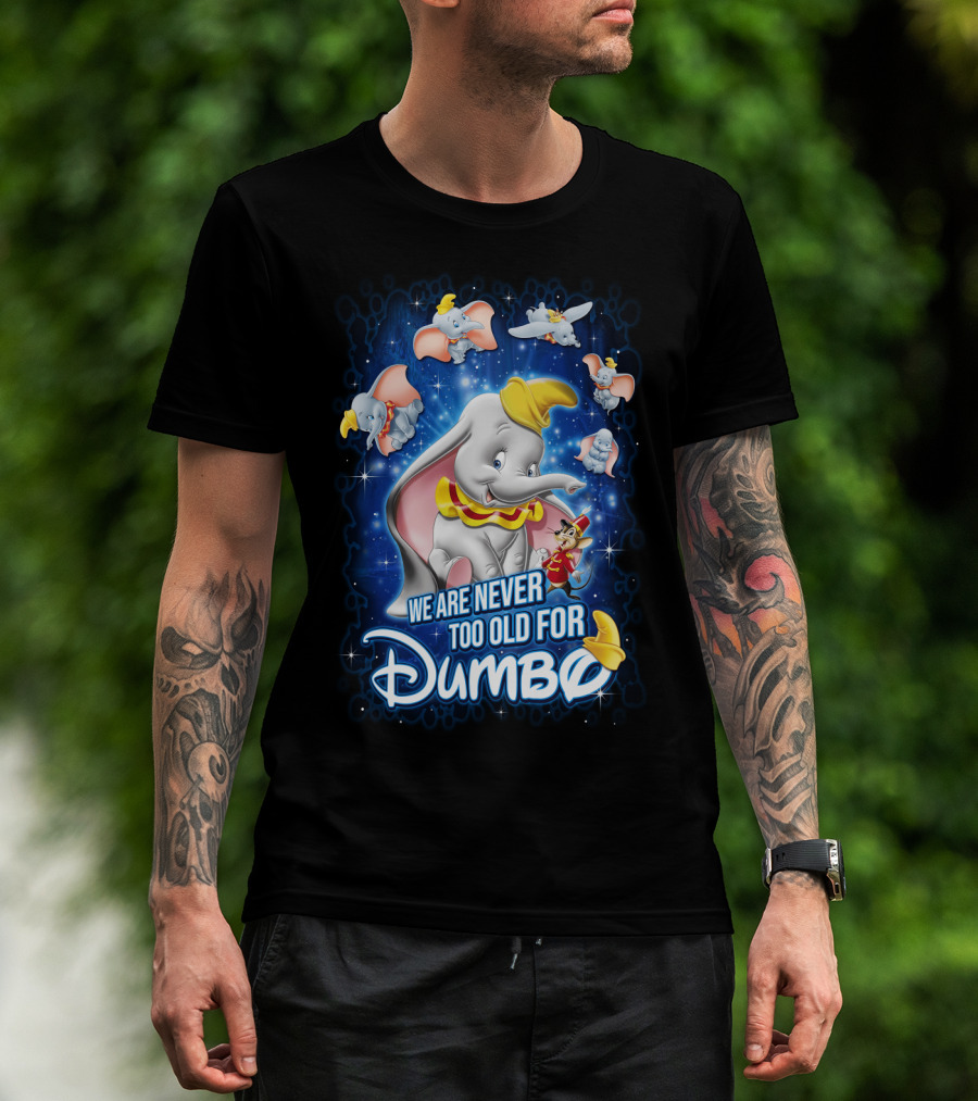 The We Are Never Too Old for Dumbo T-shirt is designed for everyday wear and a consistent fit. Fabric is pre-shrunk ring-spun cotton with durable stitching. See the size chart below for exact measurements.