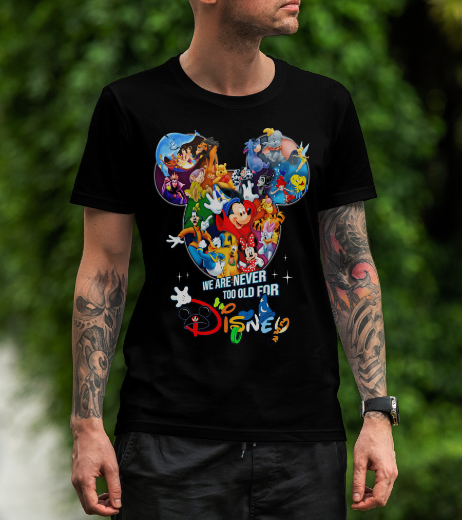 We Are Never Too Old For Disney Mickey Mouse Aladdin Lion King Ariel Minnie Goofy Dumbo Snow White T-Shirt