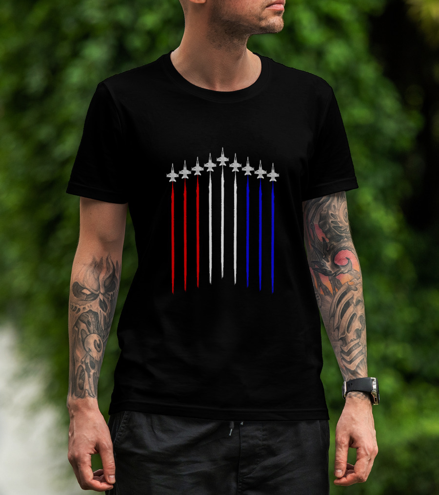 F18 Hornet Schematic Contrails In Red White Blue USA Flag T-Shirt