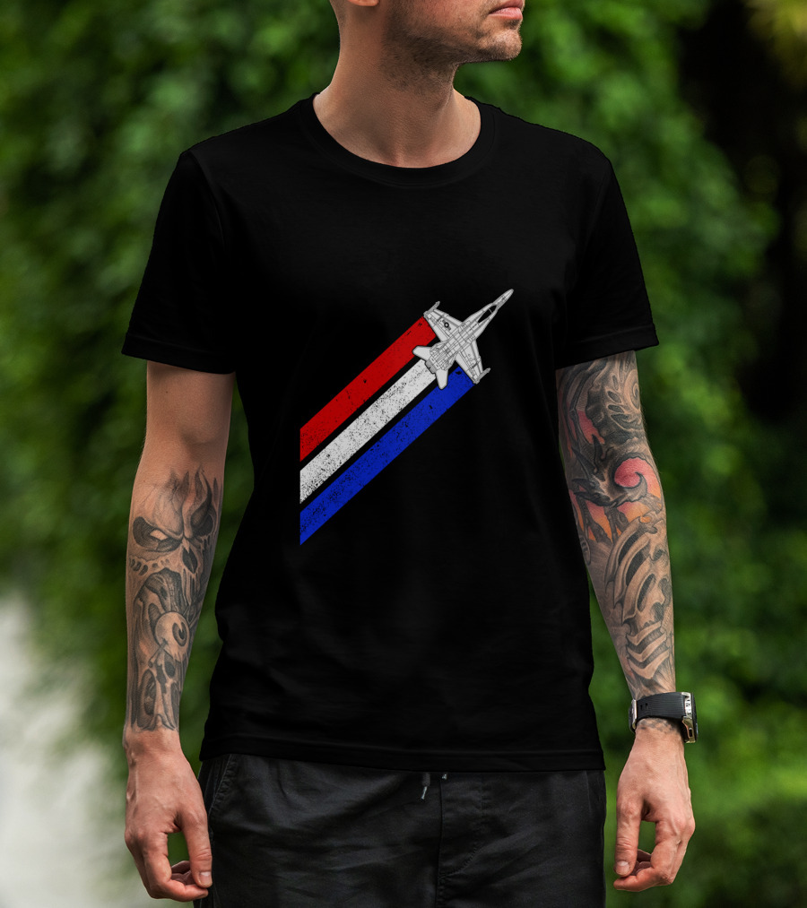 The F18 Hornet Airplane Schematic Red White Blue Vintage Stripes T-shirt is designed for everyday wear and a consistent fit. Fabric is pre-shrunk ring-spun cotton with durable stitching. See the size chart below for exact measurements.