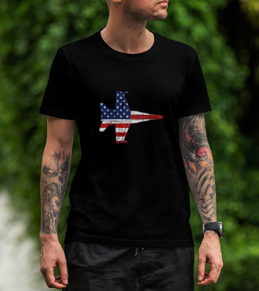 F18 Hornet Military Airplane Schematic American Flag T-Shirt