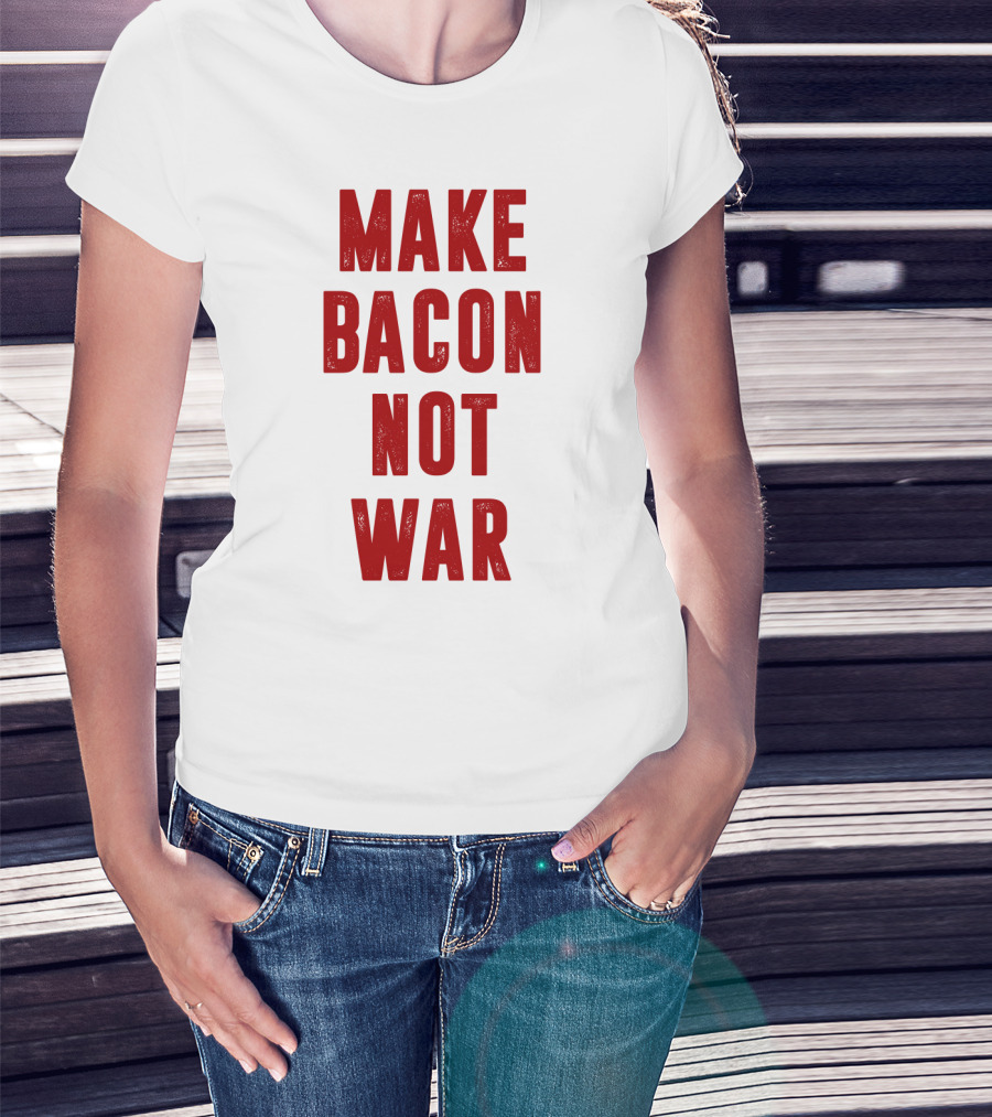 The MAKE BACON NOT WAR T-shirt is designed for everyday wear and a consistent fit. Fabric is pre-shrunk ring-spun cotton with durable stitching. See the size chart below for exact measurements.