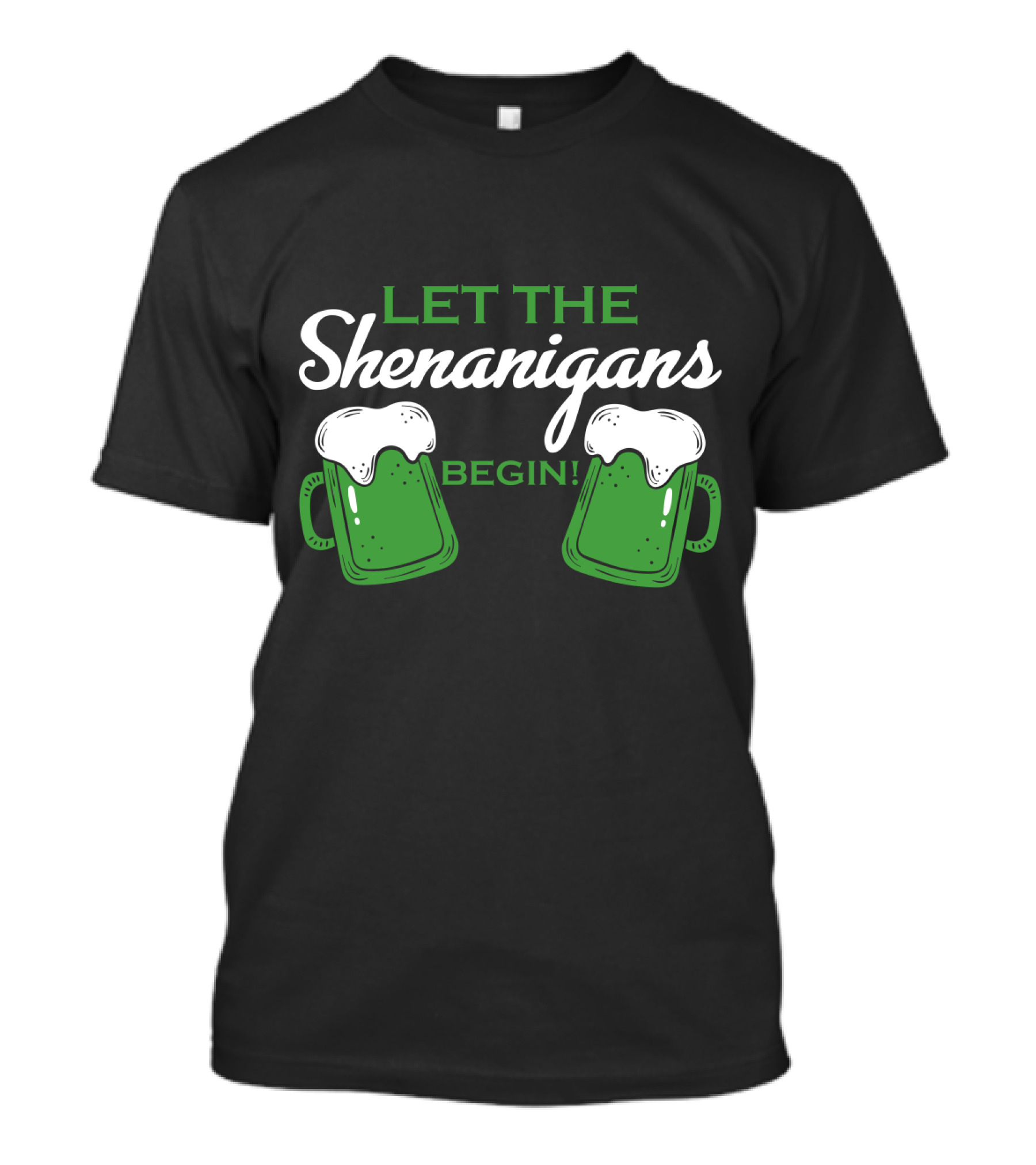 The LET THE SHENANIGANS BEGIN WITH BEER MUGS AND FOAMY TOPS T-shirt is designed for everyday wear and a consistent fit. Fabric is pre-shrunk ring-spun cotton with durable stitching. See the size chart below for exact measurements.