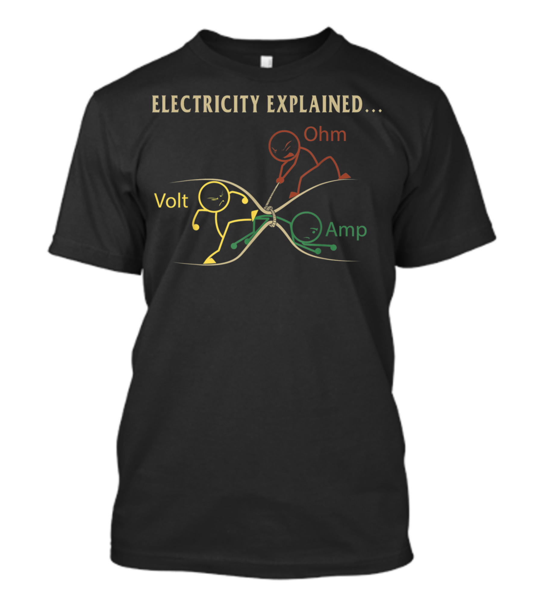 The Electricity Explained Volt Ohm Amp Tug-of-War T-shirt is designed for everyday wear and a consistent fit. Fabric is pre-shrunk ring-spun cotton with durable stitching. See the size chart below for exact measurements.