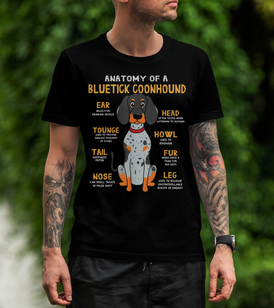 The Anatomy of a Bluetick Coonhound Funny Dog Traits and Features T-shirt is designed for everyday wear and a consistent fit. Fabric is pre-shrunk ring-spun cotton with durable stitching. See the size chart below for exact measurements.