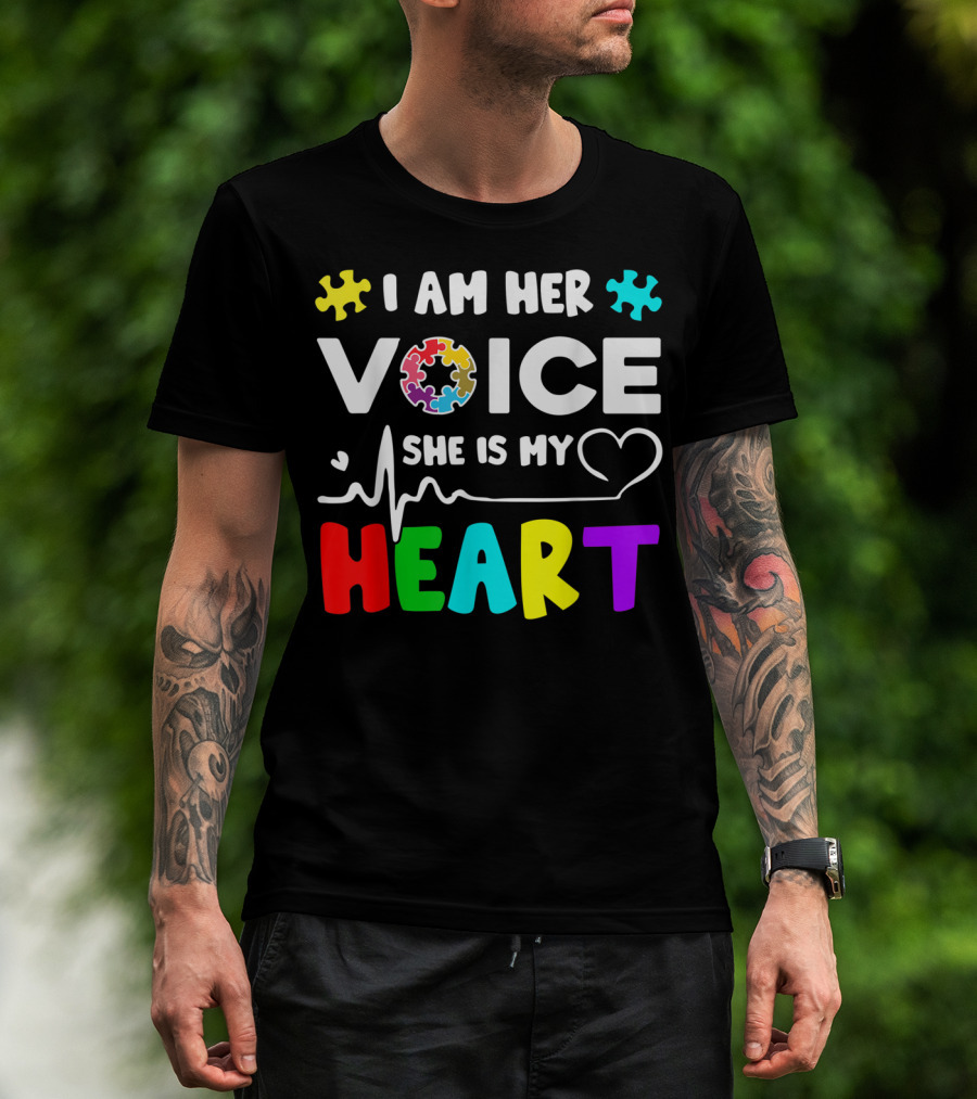 I Am Her Voice She Is My Heart Autism Awareness Puzzle Pieces T-Shirt