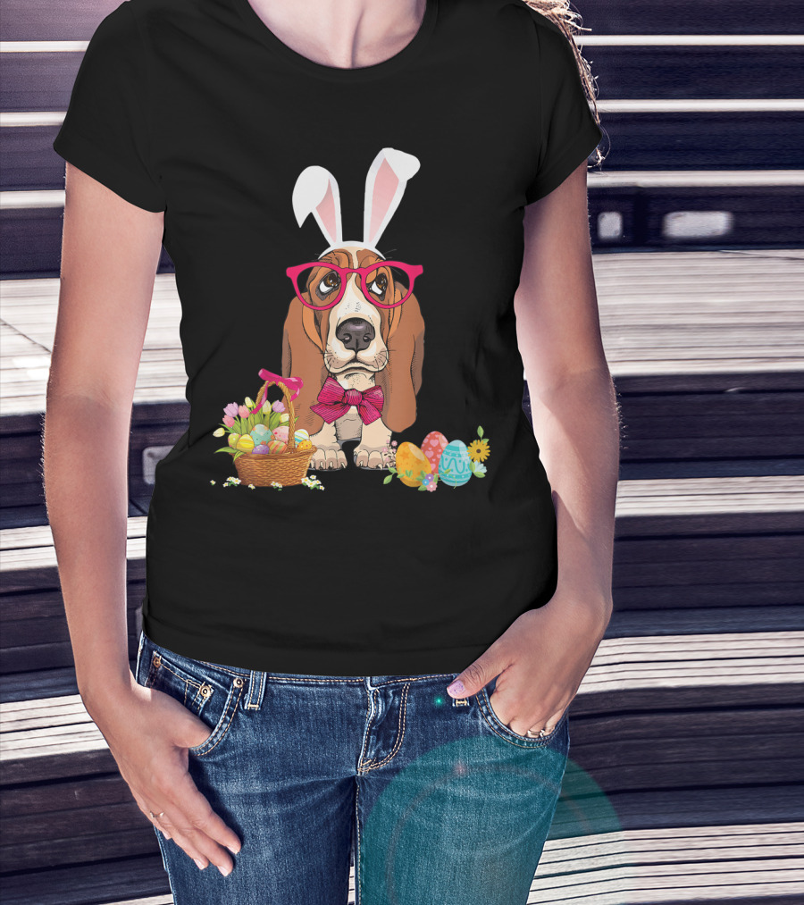 Basset Hound Bunny Rabbit With Glasses And Easter Egg Basket T-Shirt