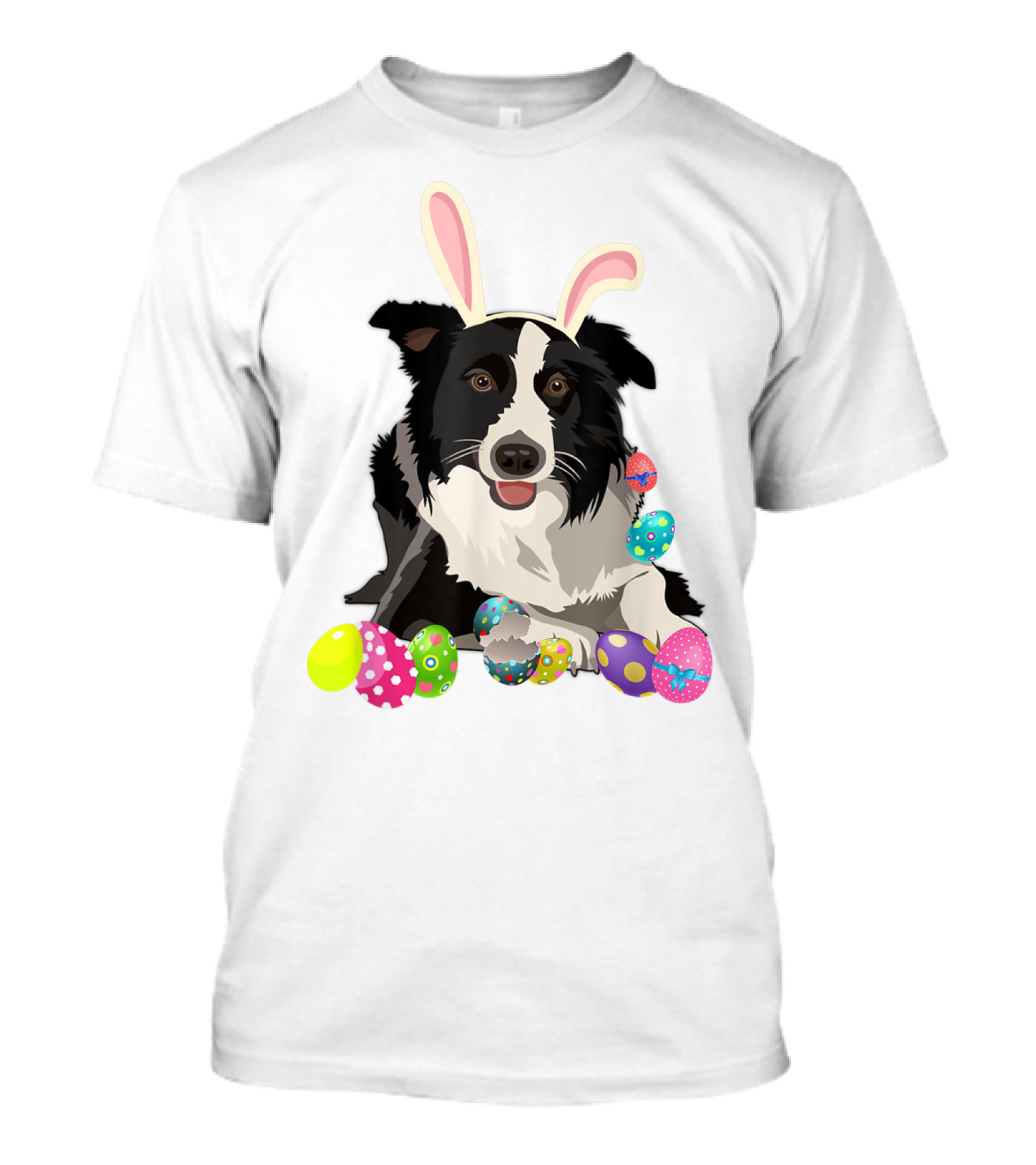 The Border Collie Dog in Bunny Rabbit Hat with Colorful Easter Eggs T-shirt is designed for everyday wear and a consistent fit. Fabric is pre-shrunk ring-spun cotton with durable stitching. See the size chart below for exact measurements.