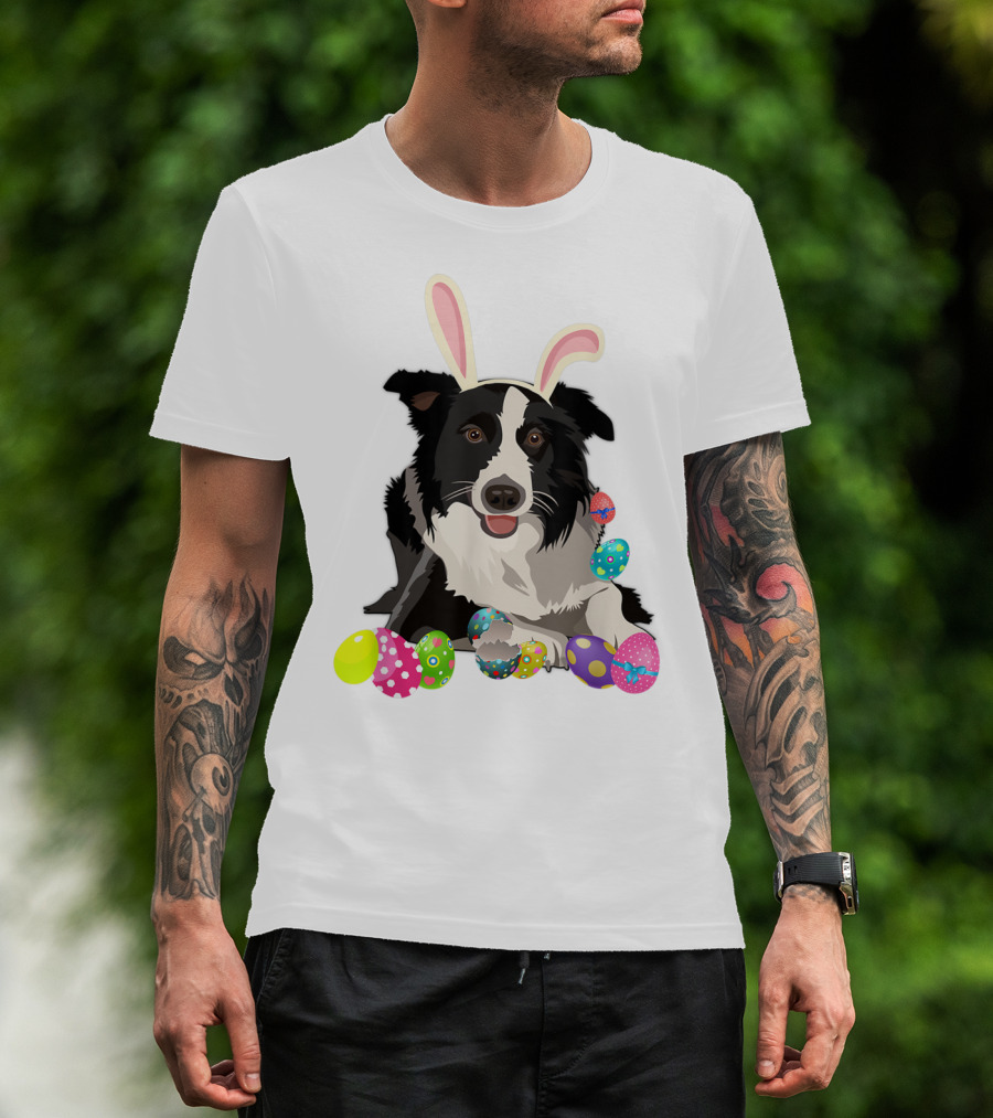 Border Collie Dog In Bunny Rabbit Hat With Colorful Easter Eggs T-Shirt