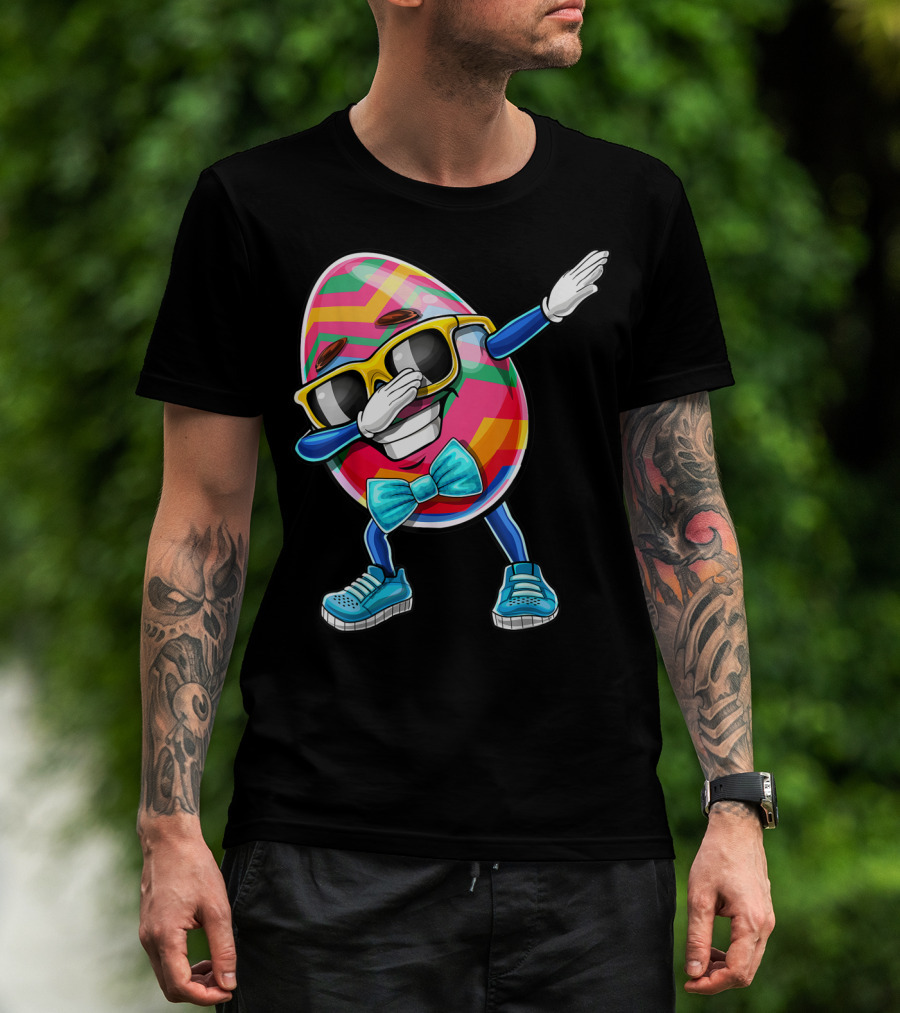 The Dabbing Easter Egg with Sunglasses and Bowtie for Easter Sunday T-shirt is designed for everyday wear and a consistent fit. Fabric is pre-shrunk ring-spun cotton with durable stitching. See the size chart below for exact measurements.