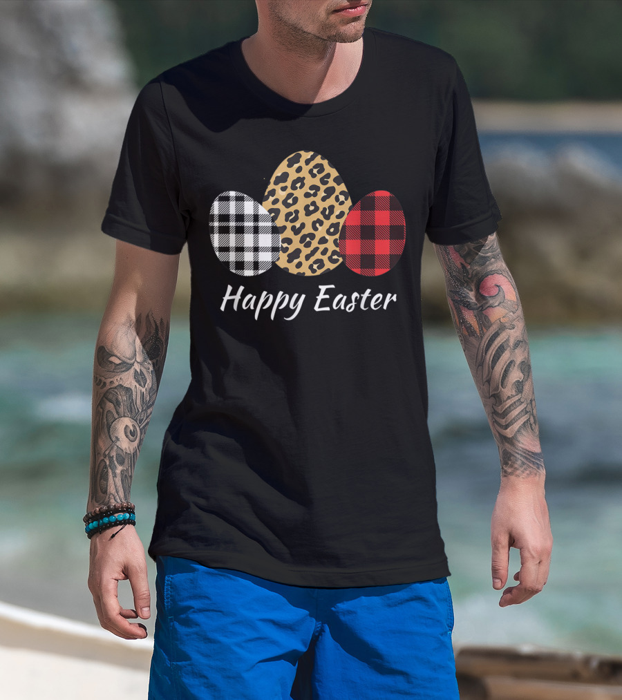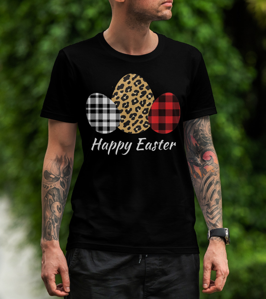 The Happy Easter Eggs Buffalo Plaid Red Leopard T-shirt is designed for everyday wear and a consistent fit. Fabric is pre-shrunk ring-spun cotton with durable stitching. See the size chart below for exact measurements.