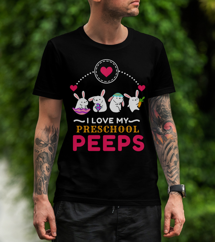 I Love My Preschool Peeps Cute Easter Bunnies Holding Carrot And Egg T-Shirt