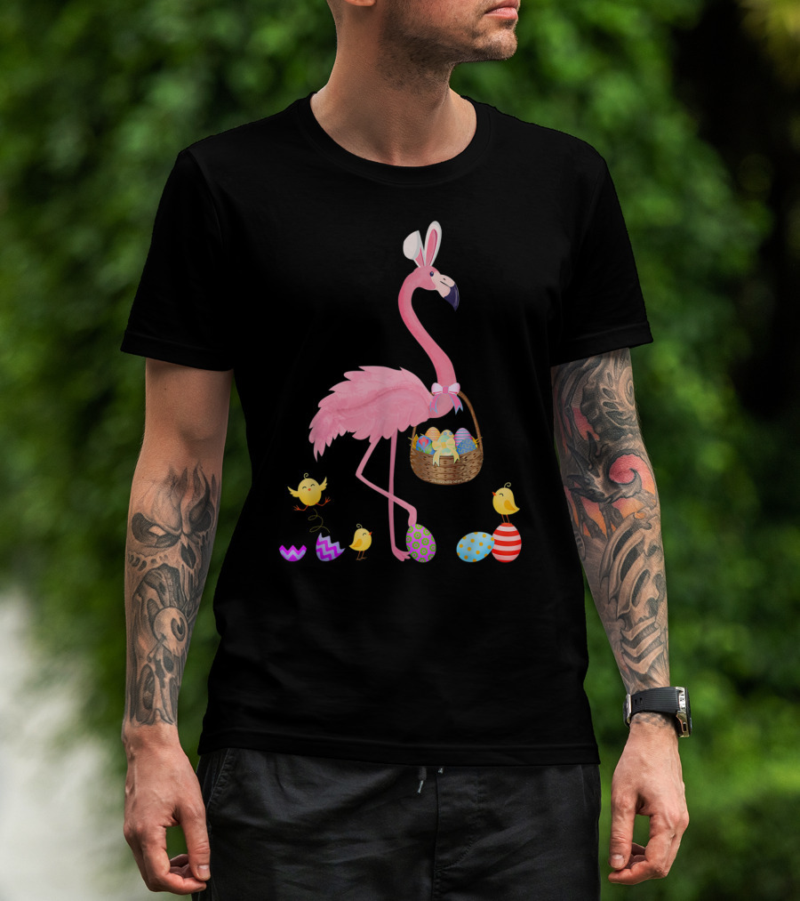 Pretty Easter Flamingo With Basket And Colorful Eggs T-Shirt
