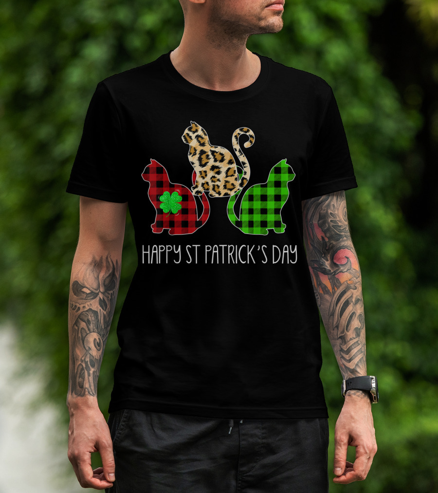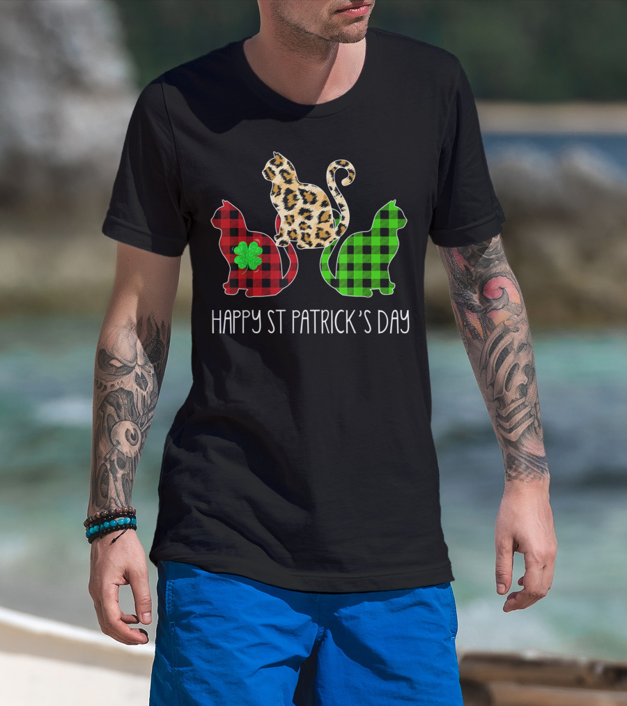 Happy St Patrick’s Day Leopard Buffalo Plaid Cat Trio T-Shirt