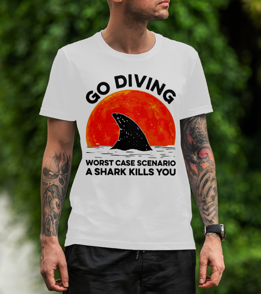 The Go Diving Worst Case Scenario A Shark Kills You Shark Fin Sunset T-shirt is designed for everyday wear and a consistent fit. Fabric is pre-shrunk ring-spun cotton with durable stitching. See the size chart below for exact measurements.