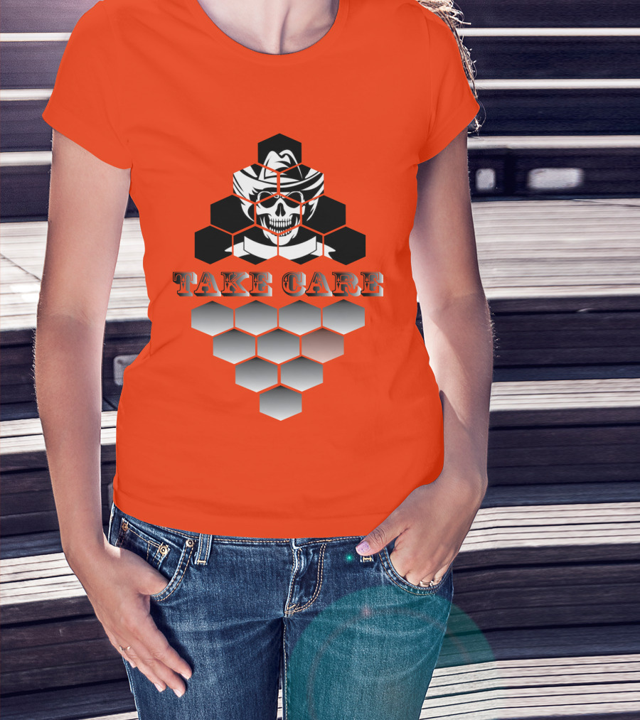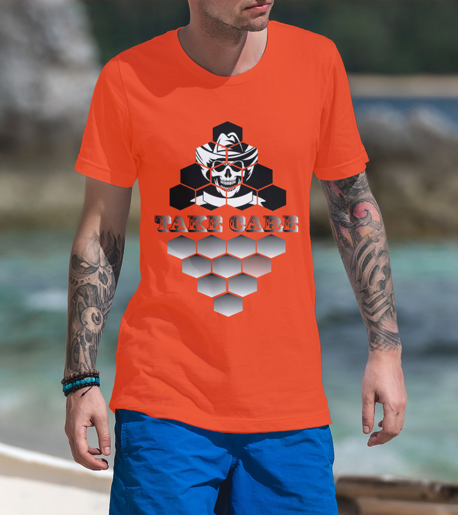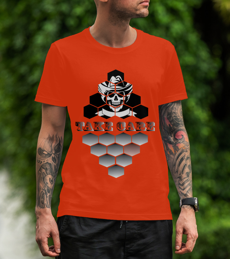 The Take Care Hexagonal Cowboy Skull T-shirt is designed for everyday wear and a consistent fit. Fabric is pre-shrunk ring-spun cotton with durable stitching. See the size chart below for exact measurements.