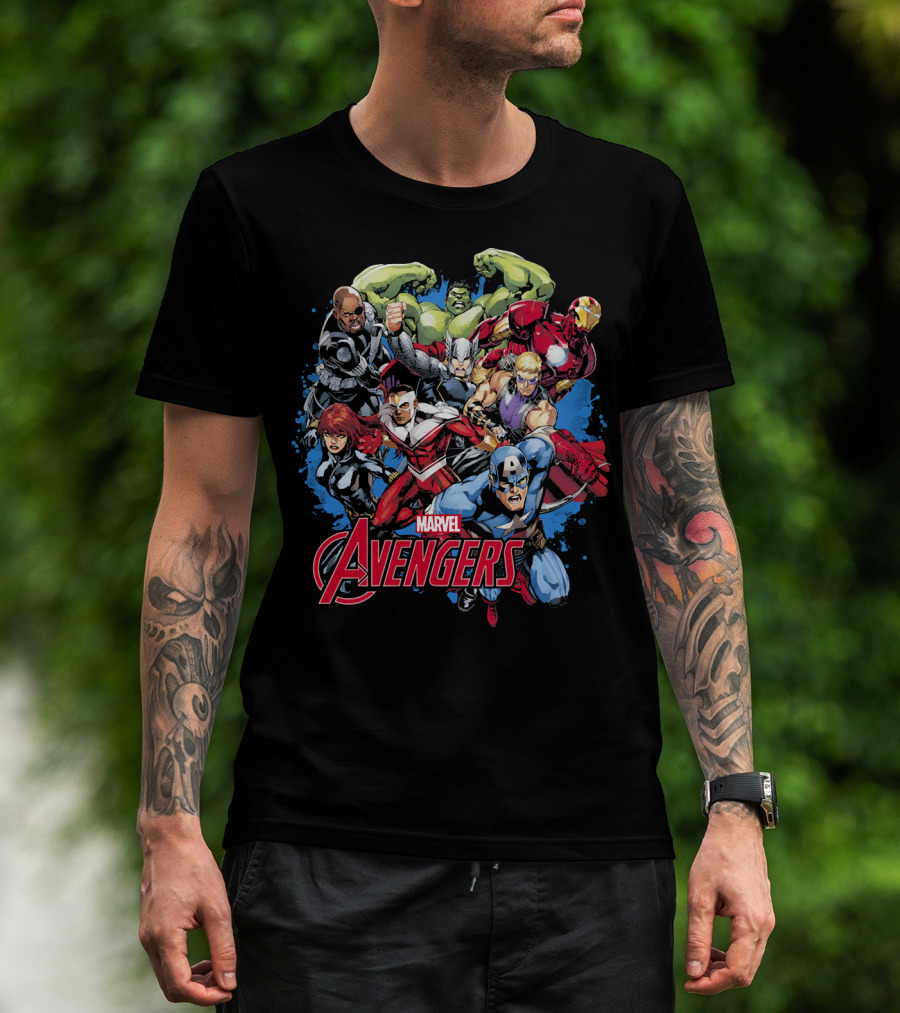 The Marvel Avengers Captain Thor Hulk Iron Man Black Widow Comic Assemblage T-shirt is designed for everyday wear and a consistent fit. Fabric is pre-shrunk ring-spun cotton with durable stitching. See the size chart below for exact measurements.