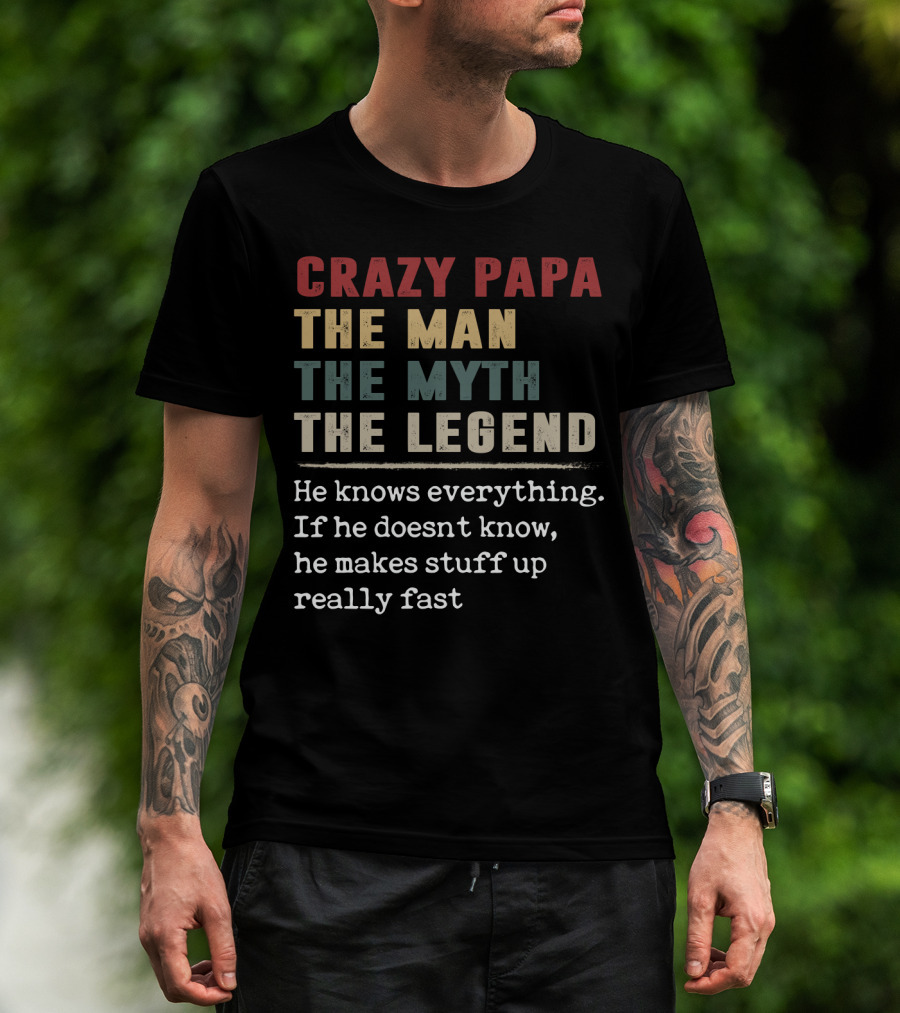 The CRAZY PAPA THE MAN THE MYTH THE LEGEND HE KNOWS EVERYTHING IF HE DOESN'T KNOW HE MAKES STUFF UP REALLY FAST T-shirt is designed for everyday wear and a consistent fit. Fabric is pre-shrunk ring-spun cotton with durable stitching. See the size chart below for exact measurements.