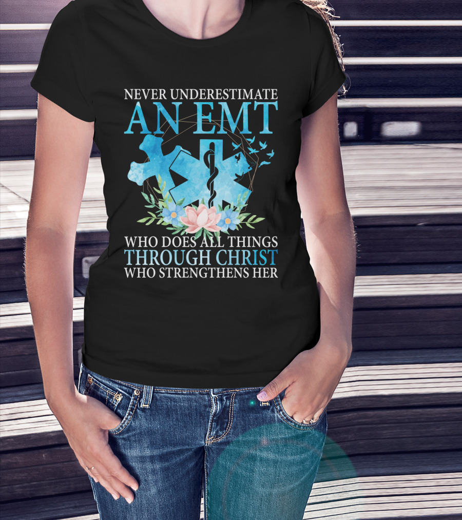 Never Underestimate An EMT Who Does All Things Through Christ Who Strengthens Her T-Shirt
