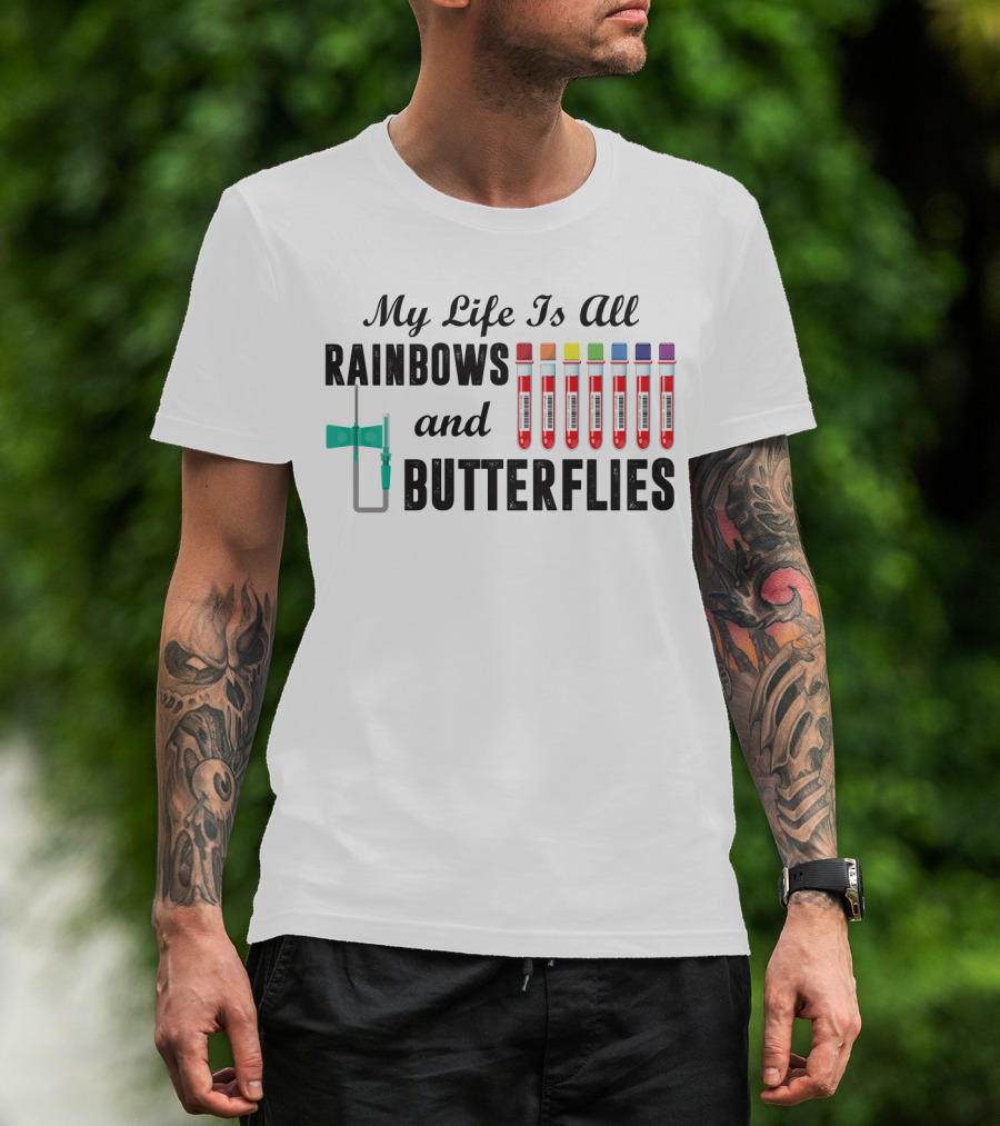 My Life Is All Rainbows And Butterflies Phlebotomist Colorful Blood Tubes T-Shirt