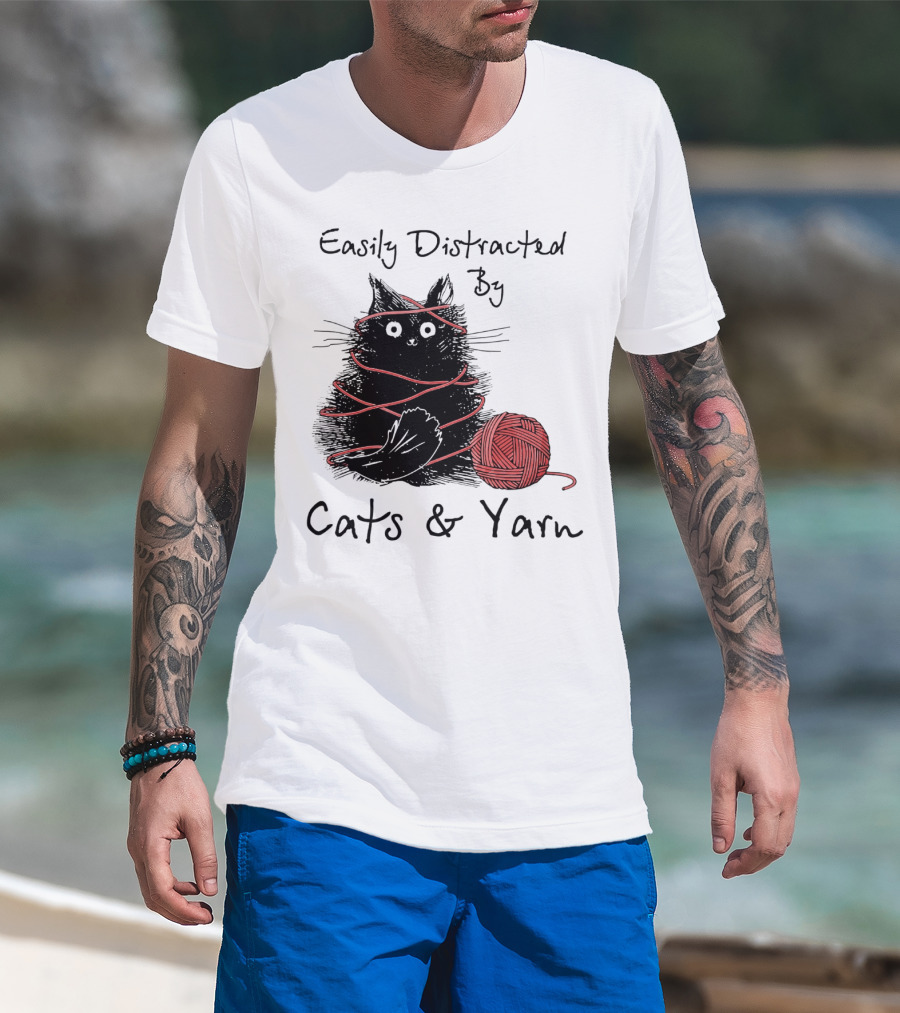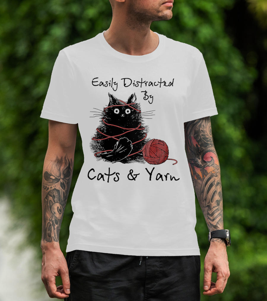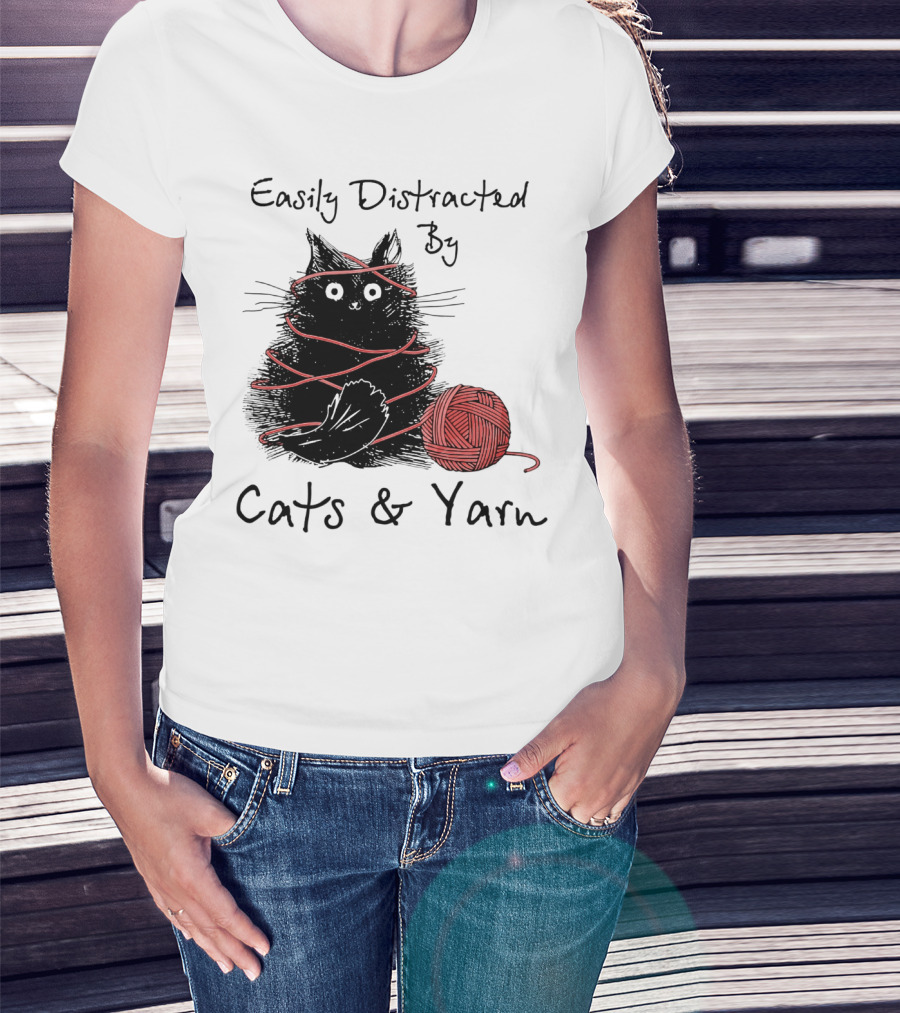 Easily Distracted By Cats And Yarn With Playful Cat Wrapped In Red Yarn T-Shirt