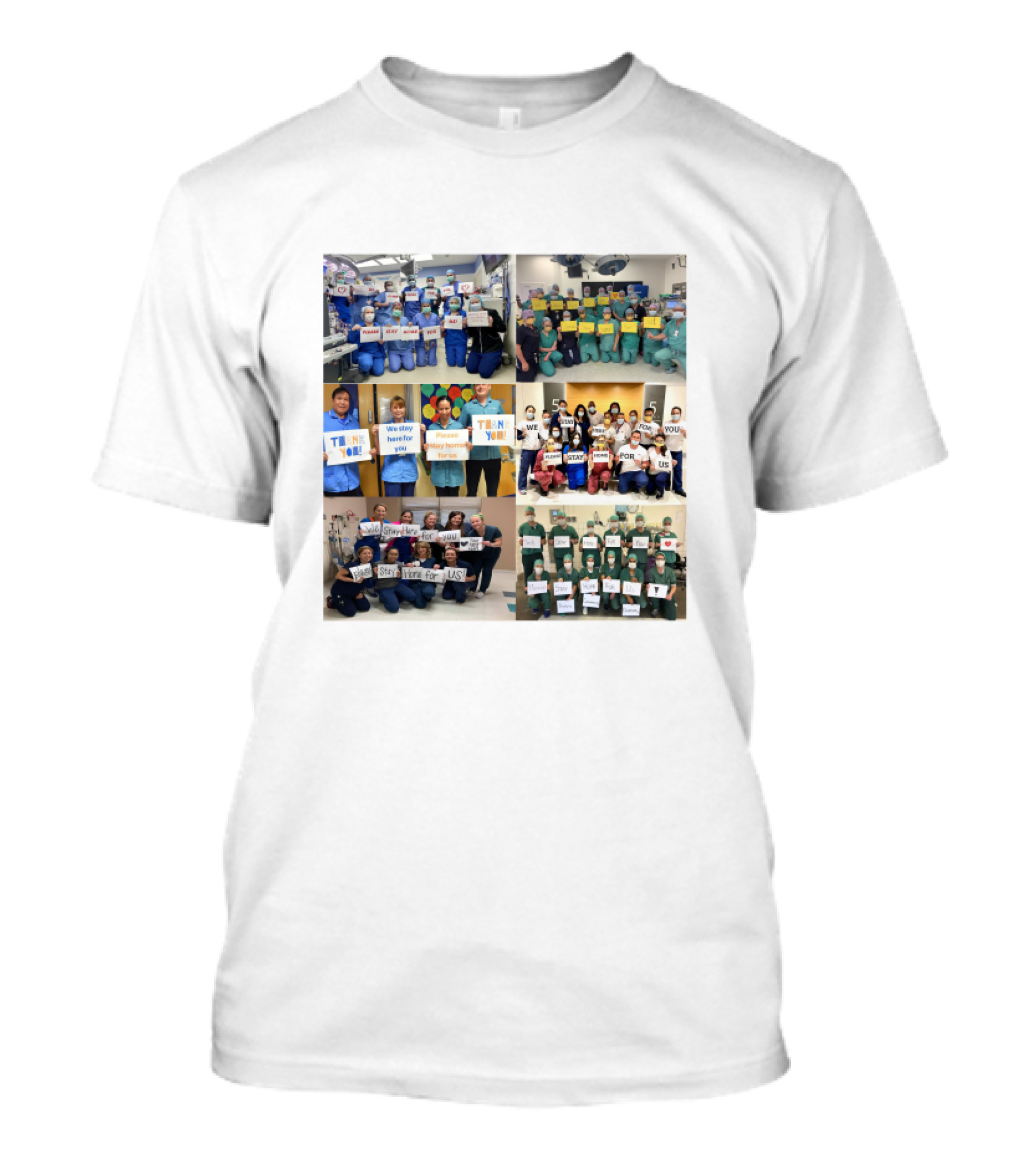 The We Stay Here for You Please Stay Home for Us Healthcare Workers Holding Signs T-shirt is designed for everyday wear and a consistent fit. Fabric is pre-shrunk ring-spun cotton with durable stitching. See the size chart below for exact measurements.