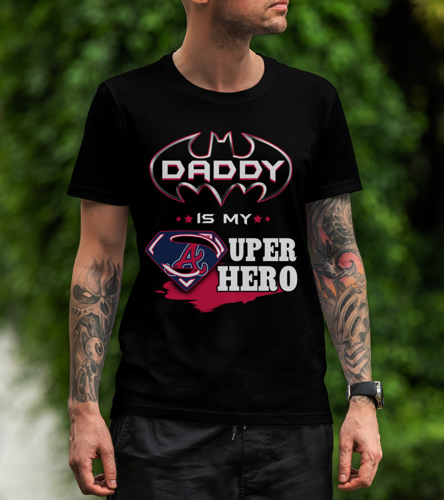The Daddy Is My Superhero Braves Dad T-shirt is designed for everyday wear and a consistent fit. Fabric is pre-shrunk ring-spun cotton with durable stitching. See the size chart below for exact measurements.