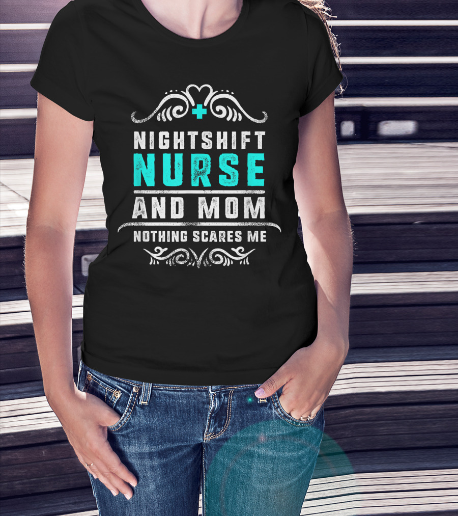 The Nurse Nightshift Mom Nothing Scares Me Bold Text and Swirl T-shirt is designed for everyday wear and a consistent fit. Fabric is pre-shrunk ring-spun cotton with durable stitching. See the size chart below for exact measurements.