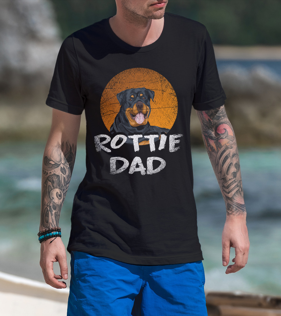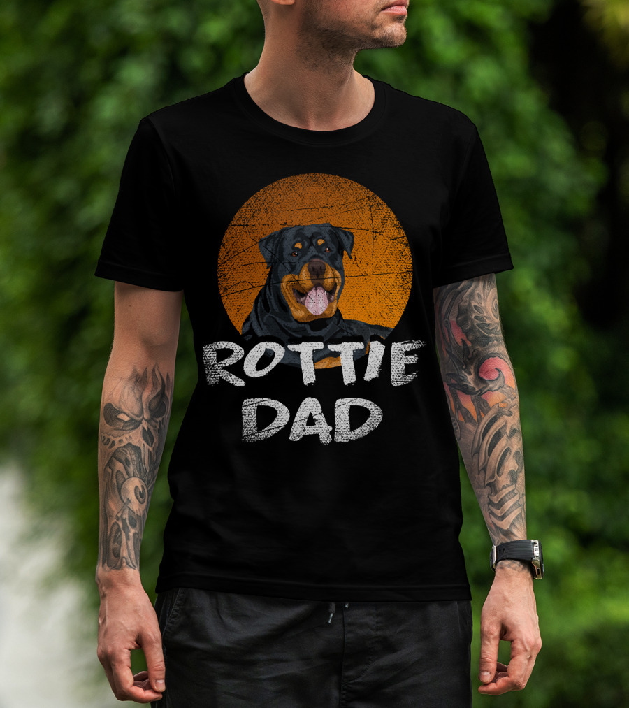 The Rottie Dad Rottweiler Dog T-shirt is designed for everyday wear and a consistent fit. Fabric is pre-shrunk ring-spun cotton with durable stitching. See the size chart below for exact measurements.