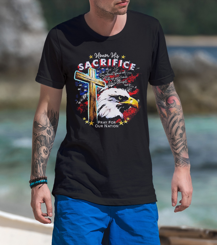 Honor His Sacrifice Pray For Our Nation Eagle American Flag Cross T-Shirt
