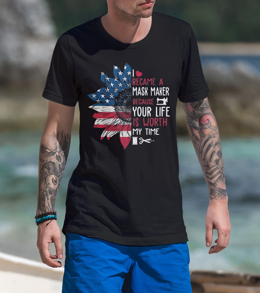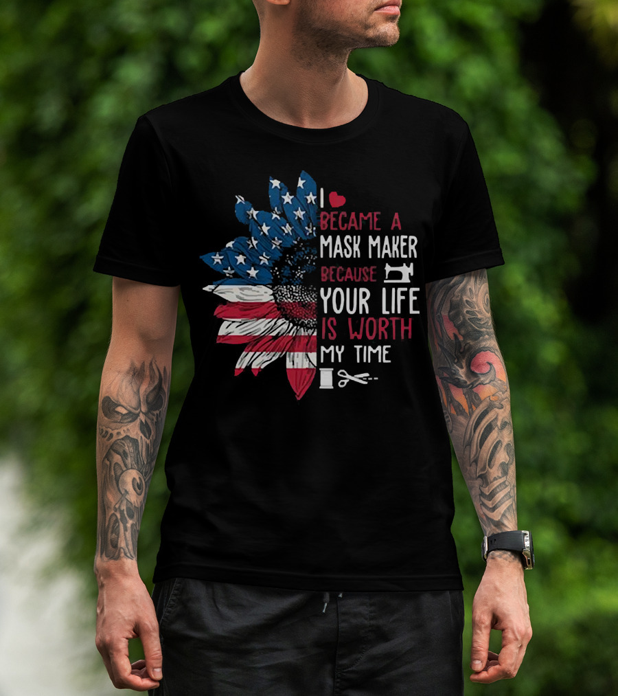 The I Love Became a Mask Maker Because Your Life Is Worth My Time Flower America Flag T-shirt is designed for everyday wear and a consistent fit. Fabric is pre-shrunk ring-spun cotton with durable stitching. See the size chart below for exact measurements.