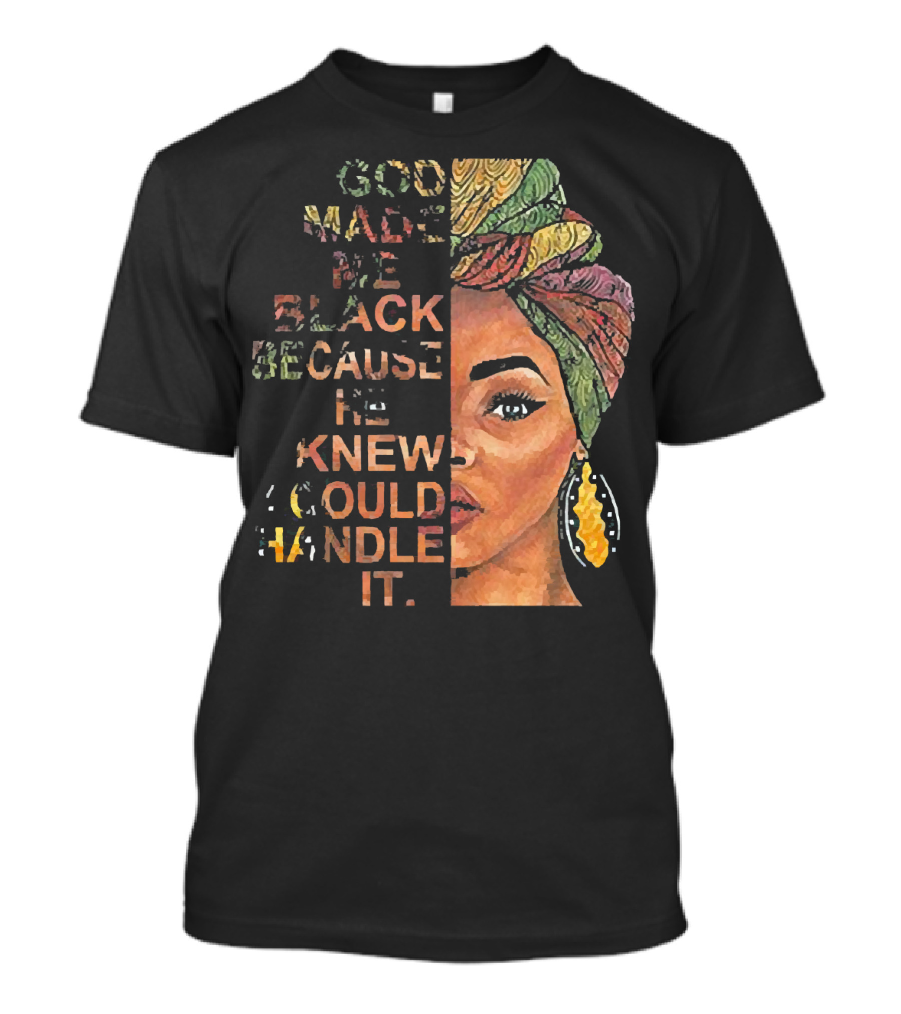 The God Made Me Black Because He Knew I Could Handle It Woman Face in Colorful Headwrap T-shirt is designed for everyday wear and a consistent fit. Fabric is pre-shrunk ring-spun cotton with durable stitching. See the size chart below for exact measurements.