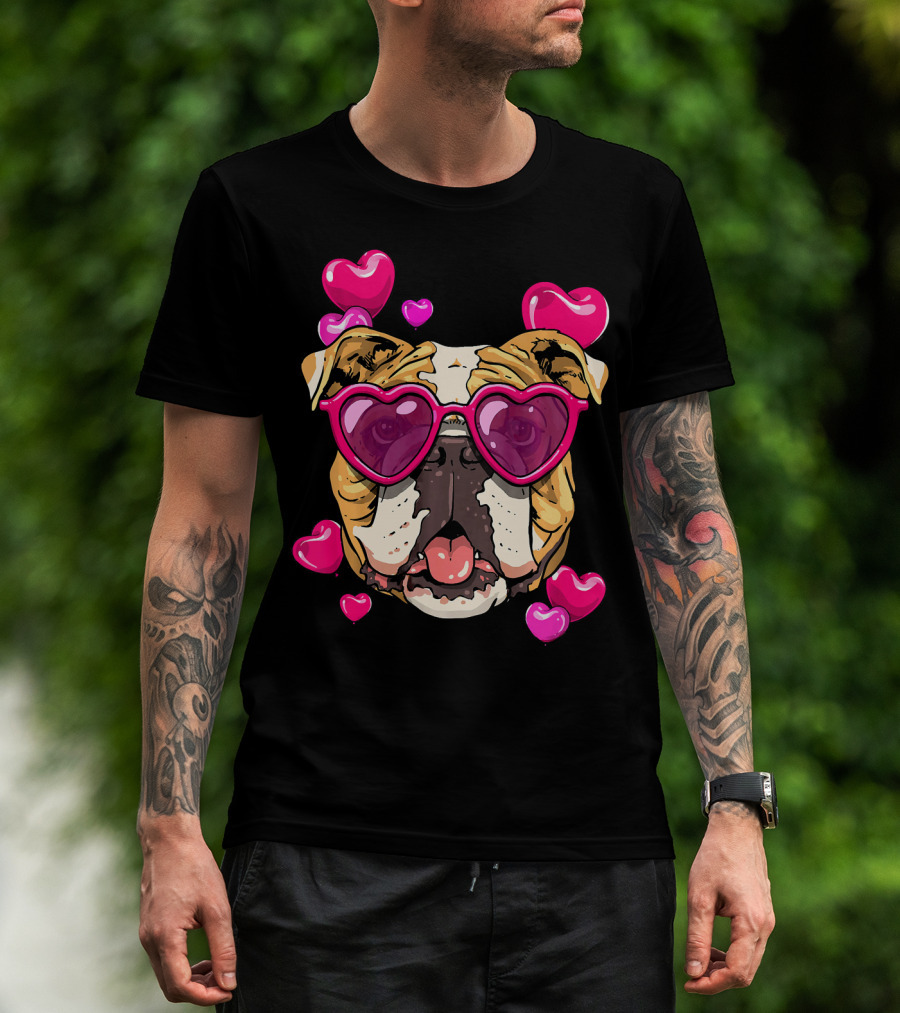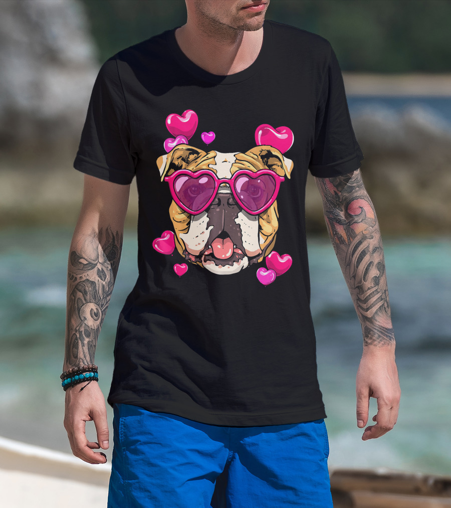 American Bulldog Heart Sunglasses Pink Hearts Valentine's Day T-Shirt