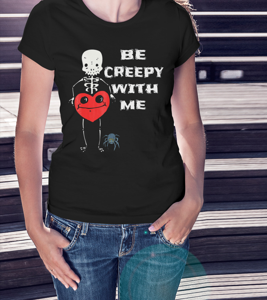 Be Creepy With Me Skeleton Holding Heart And Spider Cute Valentines T-Shirt