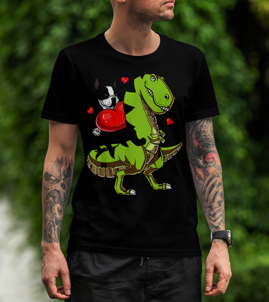 Boston Terrier With Red Hearts Riding A Green Rex Dinosaur T-Shirt