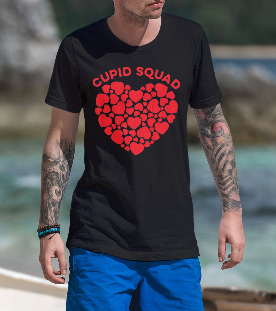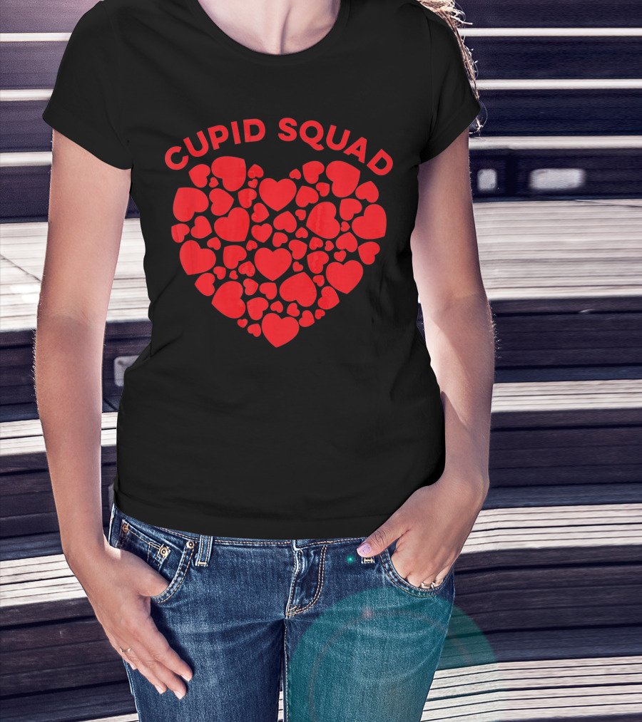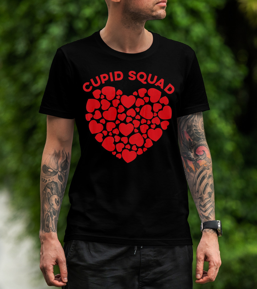 The Cupid Squad Valentines Heart T-shirt is designed for everyday wear and a consistent fit. Fabric is pre-shrunk ring-spun cotton with durable stitching. See the size chart below for exact measurements.