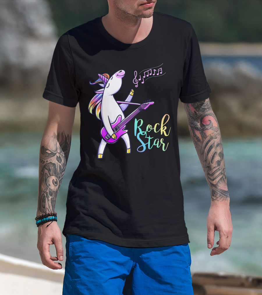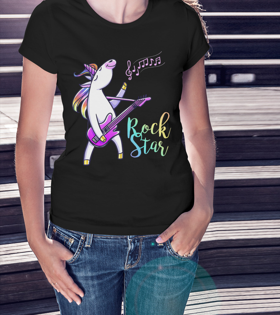 The Unicorn Rock Star with Guitar and Musical Notes T-shirt is designed for everyday wear and a consistent fit. Fabric is pre-shrunk ring-spun cotton with durable stitching. See the size chart below for exact measurements.