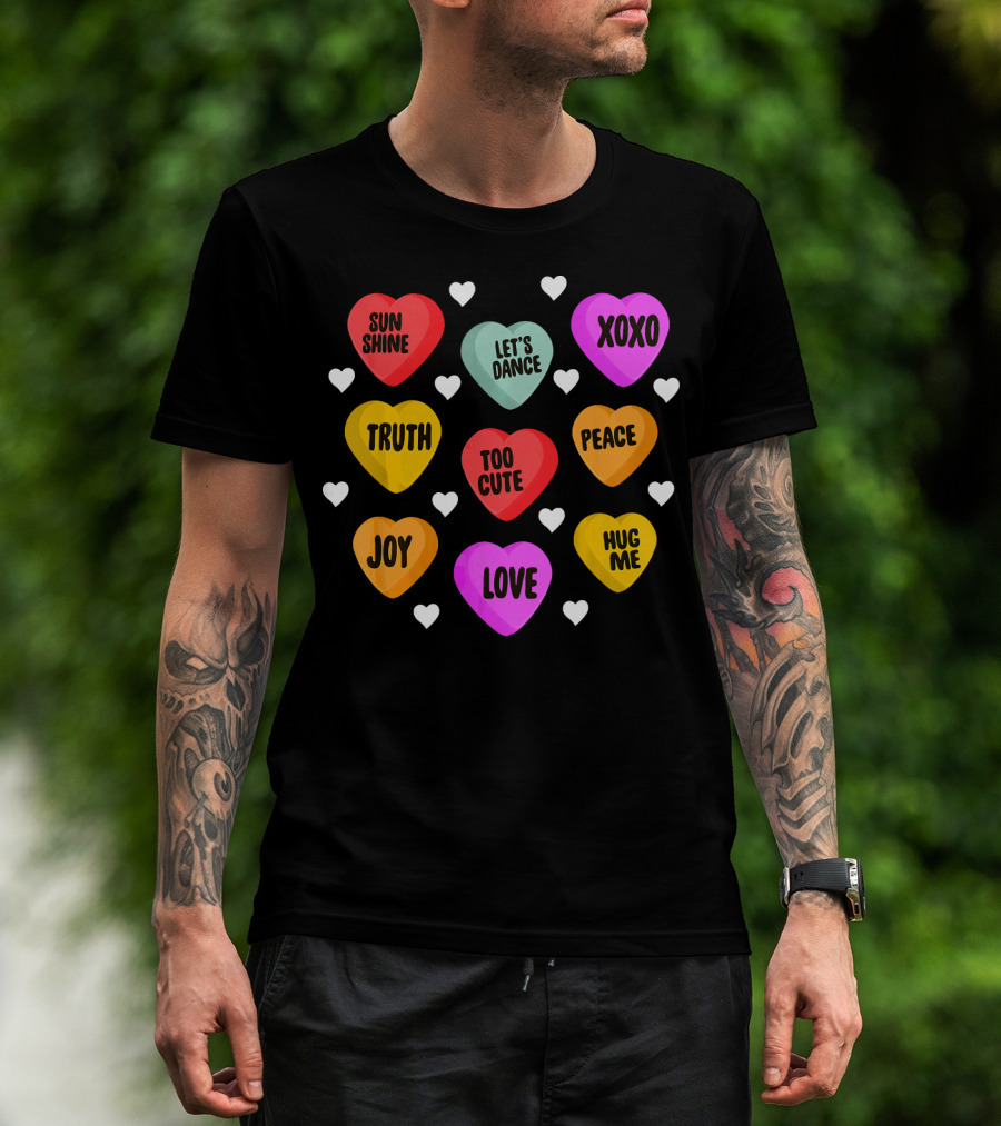 Cute Valentine Day Heart Candy Sunshine Love XOXO Joy Truth Peace Hug Me Let's Dance Too Cute T-Shirt