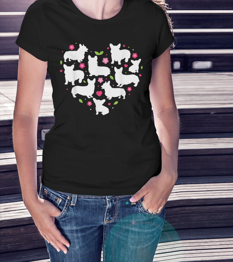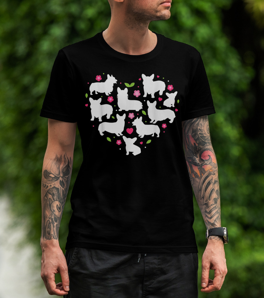 Corgi Silhouettes Heart Valentines Day Cute Dogs And Flowers T-Shirt