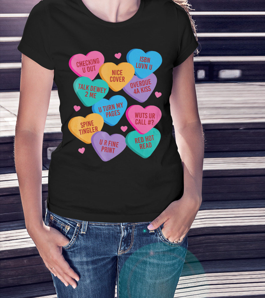 The Funny Librarian Valentines Conversation Hearts ISBN Luvn U Checking U Out T-shirt is designed for everyday wear and a consistent fit. Fabric is pre-shrunk ring-spun cotton with durable stitching. See the size chart below for exact measurements.