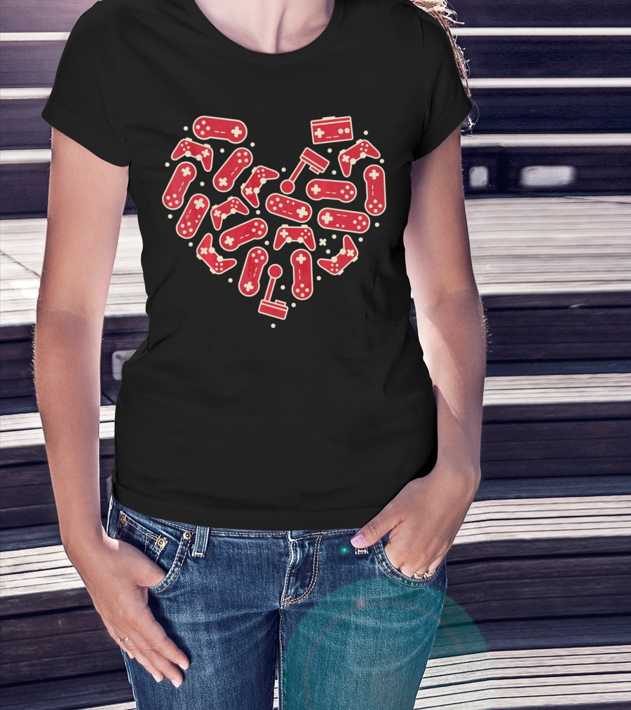 Gamer Valentines Day Couple Heart With Gaming Controllers And Joysticks T-Shirt