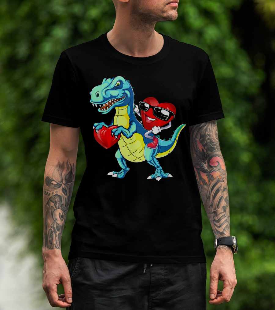Valentine Heart With Sunglasses Riding Dinosaur With Heart T-Shirt