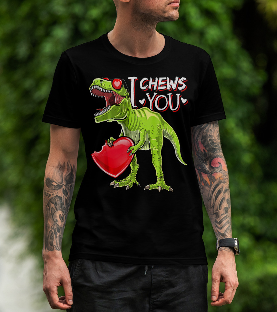 The I Chews You Valentine Rex Dinosaur Holding Heart with Red Glasses T-shirt is designed for everyday wear and a consistent fit. Fabric is pre-shrunk ring-spun cotton with durable stitching. See the size chart below for exact measurements.