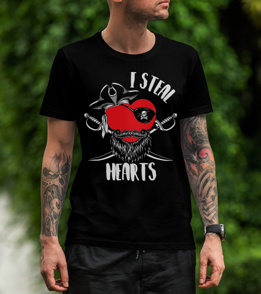 The I Steal Hearts Funny Valentines Day Pirate Beard Patch Swords T-shirt is designed for everyday wear and a consistent fit. Fabric is pre-shrunk ring-spun cotton with durable stitching. See the size chart below for exact measurements.